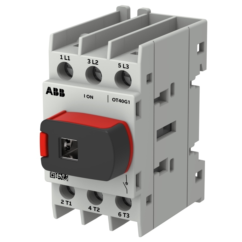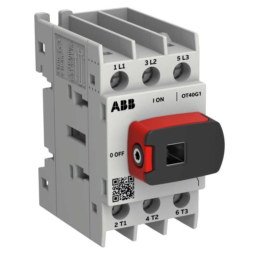OT40G1-3BS z řady OT Plus je 3pólový spínač odpojovač určený pro montáž na DIN lištu s předním ovládáním. Zařízení obsahuje integrované šroubové svorky pro snadné připojení vodičů. Součástí je univerzální knoflík, který lze přímo namontovat, zajistit visacím zámkem a umožňuje připojení hřídele pro externí ovládání.