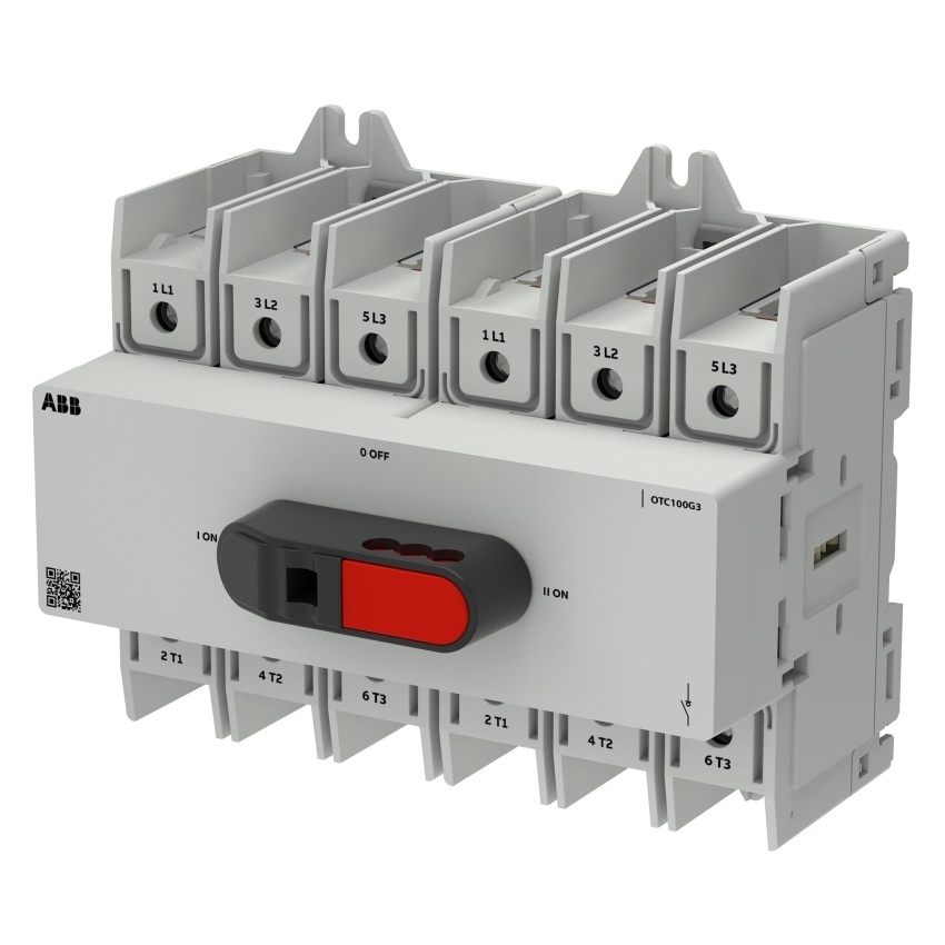 OTC100G3-3BS je 3pólový přepínač OT Plus s předním ovládáním a montáží na DIN lištu. Disponuje vestavěnými šroubovacími svorkami a přímým knoflíkem s možností zajištění visacím zámkem.