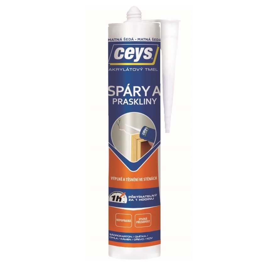 Akryl spáry a praskliny CEYS v matné šedé barvě je rychlý, tradiční akrylový tmel navržený pro těsnění a opravy málo pohyblivých spár, prasklin a malých otvorů v interiérech. Tento tmel je snadno přetíratelný jakýmkoli typem nátěru již za 1 hodinu, přičemž při schnutí nepraská a nesráží se. Vhodný je pro použití na omítku, sádrokarton, beton, kámen, cihlu, cement, maltu, dřevo i kov. Díky své vysoké odolnosti proti vibracím a neprohýbání je ideální pro trvalé utěsnění v široké škále stavebních aplikací.
