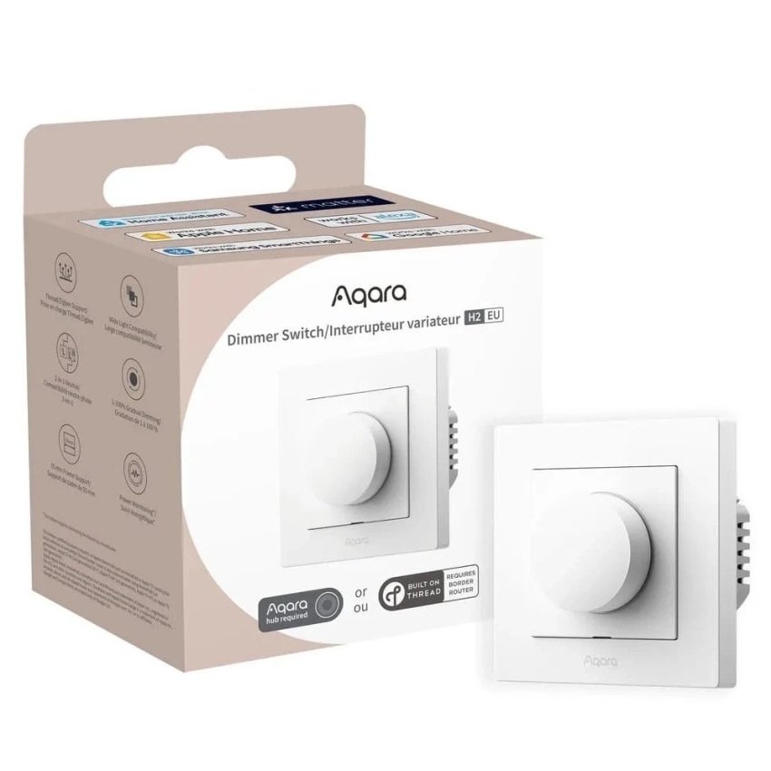 AQARA Dimmer Switch H2 EU (KD-R01D) nabízí kompatibilitu s různými typy osvětlení včetně žárovek, halogenů, stmívatelných LED a CFL. Podporuje připojení s neutrálním vodičem i bez něj a pasuje do standardních modulárních systémů System 55. Zařízení umožňuje nastavení vlastních limitů jasu a monitorování spotřeby energie přes aplikaci Aqara Home. Díky podpoře protokolů Zigbee a Thread umožňuje flexibilní integraci s platformami třetích stran a nabízí dálkové ovládání, plánování a statistiky spotřeby energie.