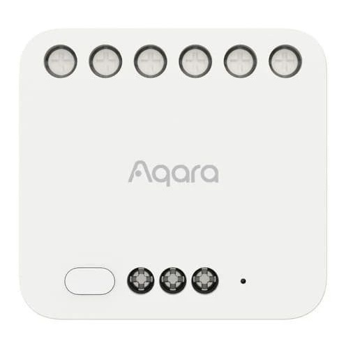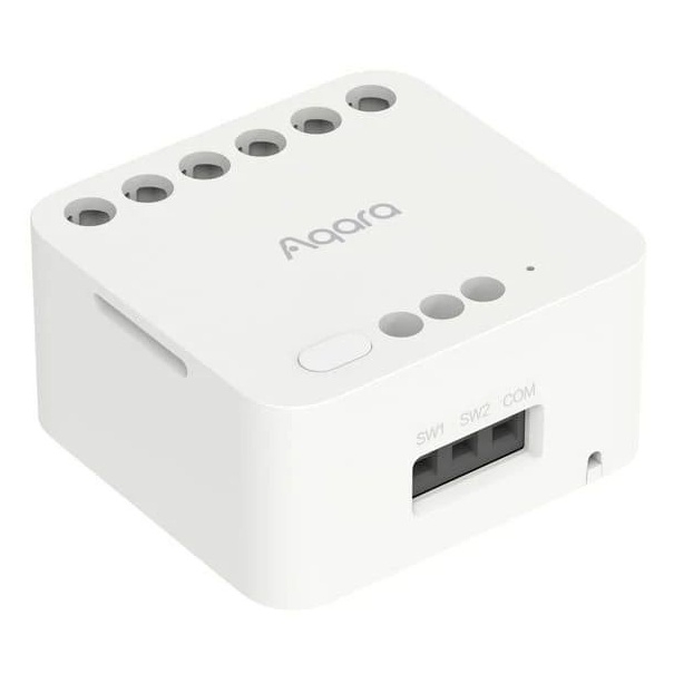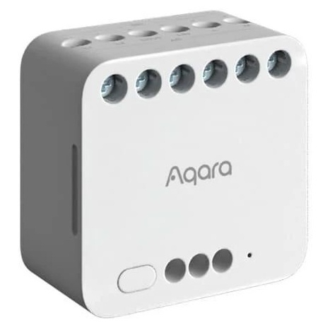 AQARA Dual Relay Module T2 (DCM-K01) je 2-kanálový reléový ovladač využívající Zigbee technologii pro zapínání a vypínání zařízení jako jsou motory, garážová vrata, světla či zásuvky. Modul podporuje režimy suchého a mokrého kontaktu, montáž na DIN lištu a integraci s platformami Apple Home, Google Home, Amazon Alexa a Matter přes Hub. Nabízí funkce měření výkonu, paměť napájení a možnost přeměny stávajících vypínačů na bezdrátové ovladače scén.