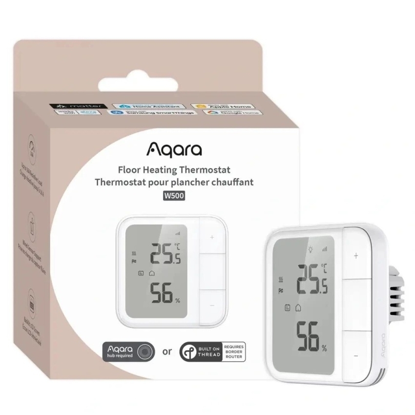 AQARA Floor Heating Thermostat W500 (UT-A01D) je chytrý termostat pro elektrické i vodní podlahové vytápění s podporou protokolů Zigbee a Thread pro integraci do smart domácností.