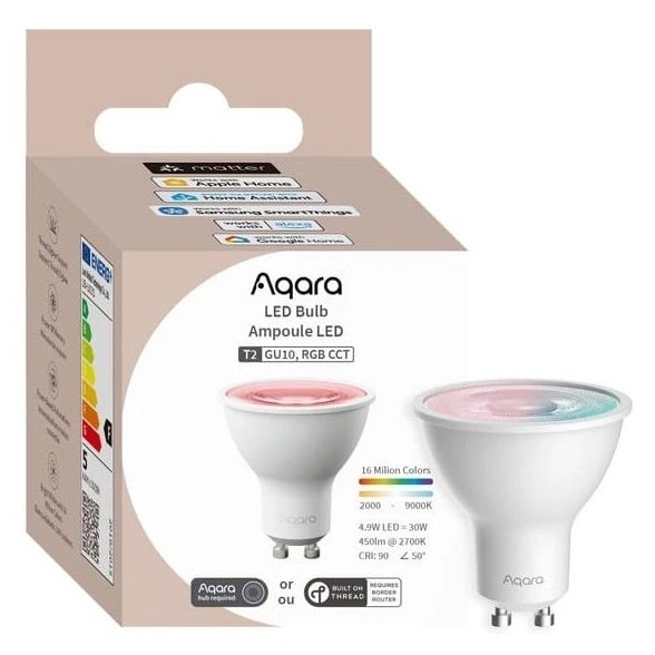 AQARA LED Bulb T2 (GU10, RGB CCT) je inteligentní LED žárovka s podporou Zigbee a Thread, nabízející 16 milionů barev a laditelné bílé světlo s vysokým indexem podání barev Ra>90.