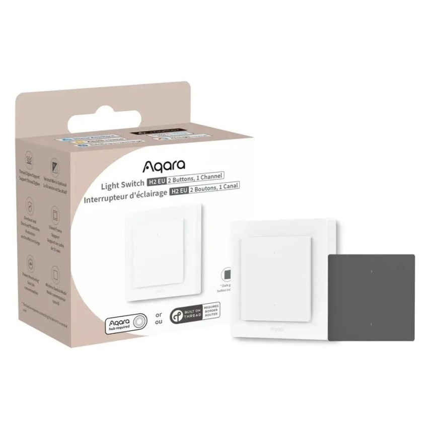 AQARA Light Switch H2 EU (2 Buttons, 1 Channel) (WS-K07D) nabízí flexibilní ovládání světel a dalších zařízení prostřednictvím protokolů Matter over Thread a Zigbee. Vypínač je kompatibilní se standardními 55 mm rámy a umožňuje instalaci s neutrálním vodičem i bez něj, přičemž podporuje monitorování spotřeby energie a ochranu proti přetížení a přehřátí. Dvě tlačítka zahrnují jedno relé pro ovládání zátěže do 8 A a bezdrátové tlačítko pro spouštění scén nebo automatizací, přičemž režim bezdrátového přepínání umožňuje personalizované ovládání.