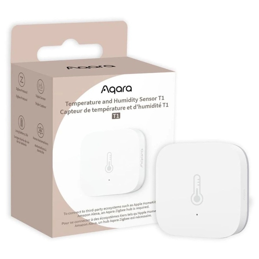 AQARA Temperature and Humidity Sensor T1 (TH-S02D) monitoruje v reálném čase teplotu, vlhkost a atmosférický tlak v interiéru s přesností ±0,3 °C pro teplotu a ±3 % pro vlhkost. Data se ukládají do Zigbee hubu a jsou dostupná v aplikaci s možností spouštění automatizací v chytré domácnosti. Senzor podporuje OTA aktualizace a integraci s platformami Apple Home, Amazon Alexa, Google Home, Matter, Samsung SmartThings a Yandex Smart Home. Napájí se baterií CR2032 s výdrží až 2 roky a má kompaktní rozměry 36 × 36 × 9 mm.