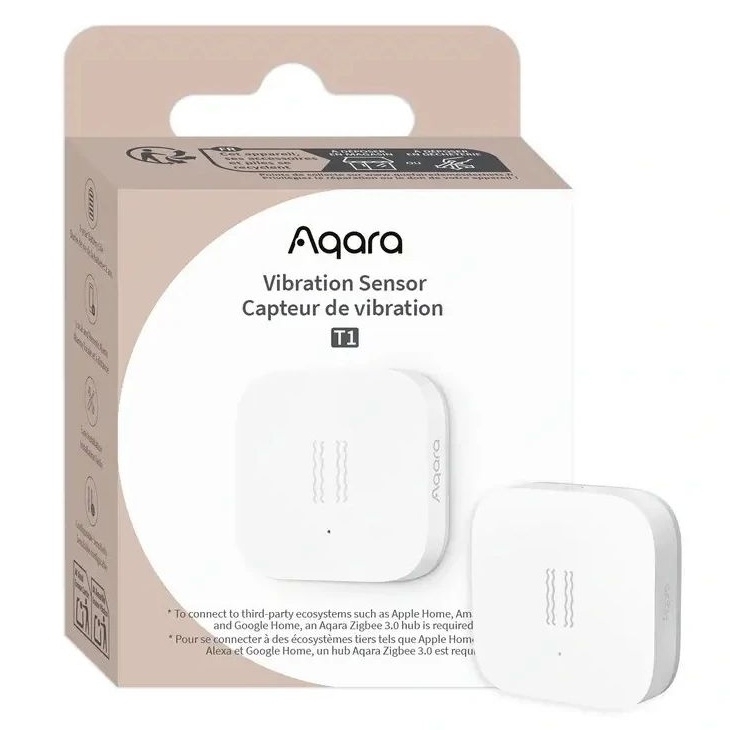 AQARA Vibration Sensor T1 (VB-S01D) detekuje vibrace, náklon a pády s vysokou přesností díky zabudovanému akceleračnímu senzoru. Umožňuje nastavení citlivosti na vysokou, střední nebo nízkou úroveň a podporuje automatizaci spuštěnou trojitým klepnutím bez nutnosti použití telefonu. Zařízení komunikuje přes protokol Zigbee 3.0, integruje se s Apple Home, Alexa a Google Home přes Matter Bridge a je napájeno dvěma bateriemi CR2032 s výdrží až 2 roky.