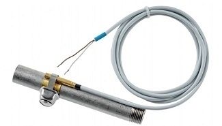 Příložné čidlo teploty. Pro měření teploty na potrubí a klenutých površích. PVC kabel a mosazná jímka pro rychlou odezvu a přesnost.