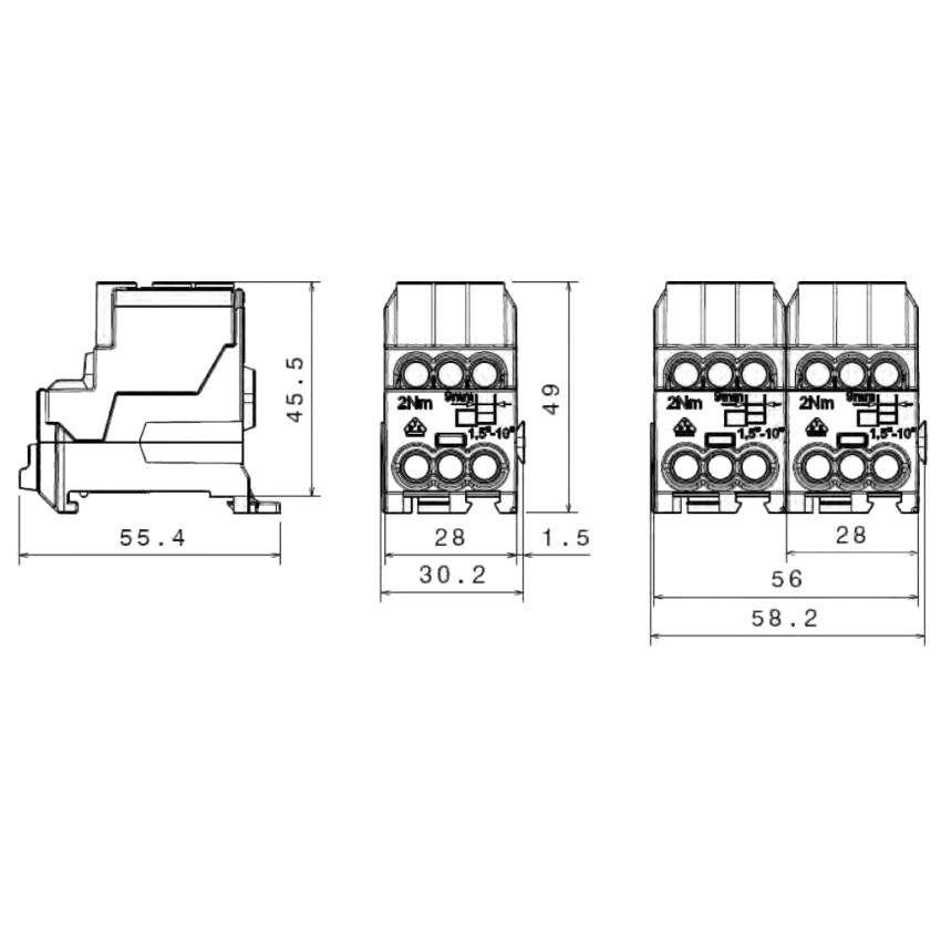 Blok pro rozdělení fází UVB 100 L G, 1pólový, jmenovitý proud Cu 101A, Al 100A, jmenovité napětí 1000V, barva šedá, montáž na DIN lištu, krytí IP20, vstup 2x25mm2, výstup 6x10mm2, řaditelný.
