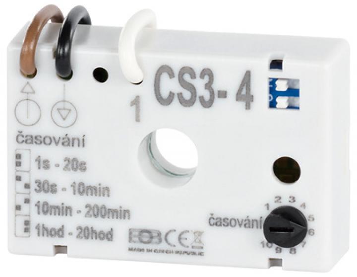 Časový spínač pod vypínač. Spínač pod vypínač CS3-4 je vhodné použít jako schodišťový automat v zapojení bez nulového vodiče. Vlastnosti: je určen ke zpožděnému vypnutí odporové, nebo indukční zátěže - ventilátory, stykače, relé. K zapnutí dojde okamžitě při stisknutí tlačítka, ale samotné časování začne po rozpojení tlačítka.
