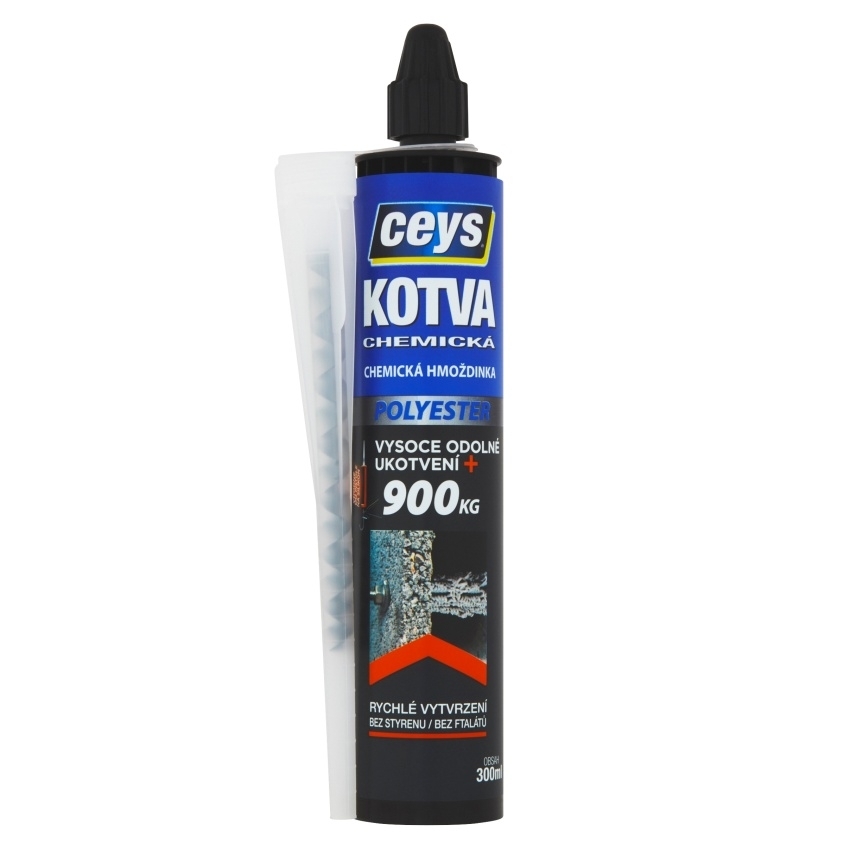 Polyesterová dvousložková kotva pro vemi silné ukotvení do dutých, křehkých nebo kompaktních podkladů. Vytvrdne do 6min, odolnost vůči zátěži 900kg. Vysoká teplotní odolnost až do +110 °C. Bez styrénu, bez ftalátu.