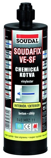 SOUDAFIX VE-SF - je vysoce kvalitní vodě odolná dvousložková hmota na bázi vinylesterové pryskyřice připravená k okamžitému požití. Rychle tuhnoucí, použitelná v širokém spektru teplot i na mokré zdivo, vodě odolná, bez styrenu. Zajišťuje pevné kotvení bez působení napětí v podkladu, upevnění kovových kotev, svorníků, armovacích prvků, závitových tyčí, profilů apod. do plných i dutých materiálů jako beton, popraskaný beton, plné cihly, duté cihly, pórobeton, přírodní kámen, sádrokarton apod.