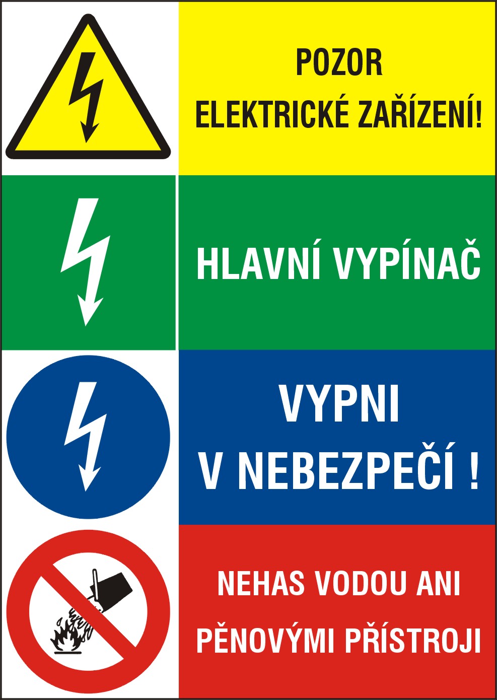 Samolepící etiketa: POZOR ELEKTRICKÉ ZAŘÍZENÍ + HLAVNÍ VYPÍNAČ + VYPNI V NEBEZPEČÍ + NEHAS VODOU ANI PĚNOVÝMI PŘÍSTROJI