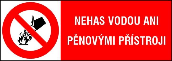 Samolepící etiketa: NEHAS VODOU ANI PĚNOVÝMI PŘÍSTROJI.