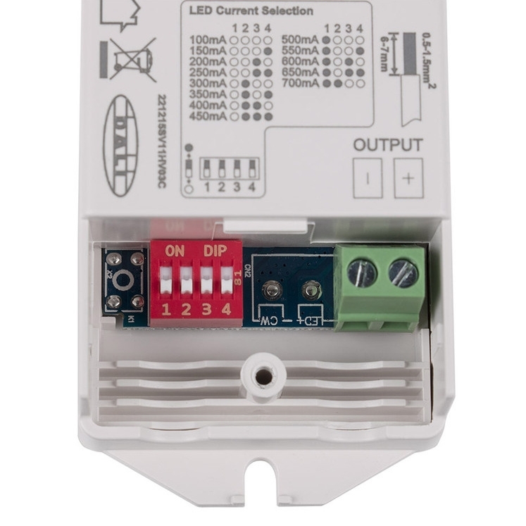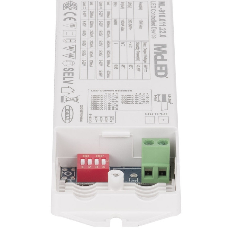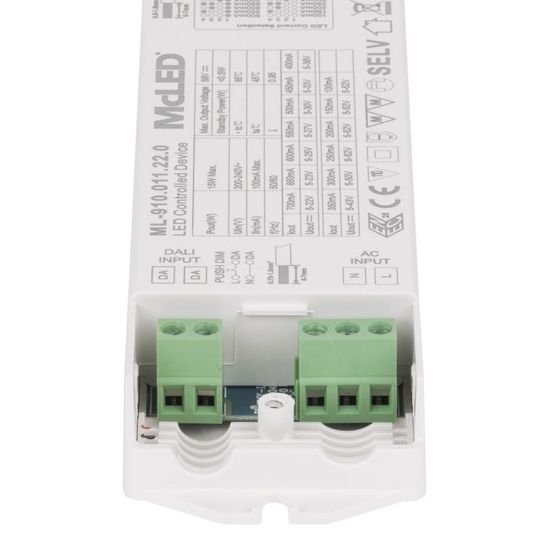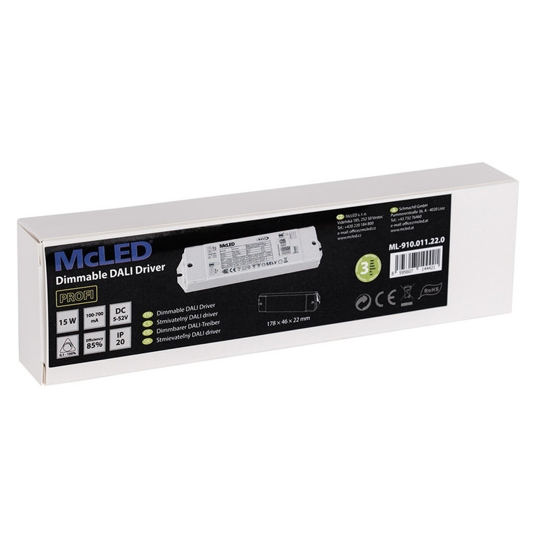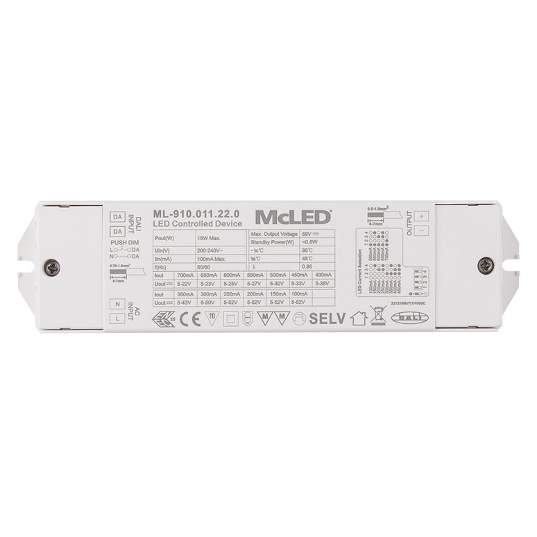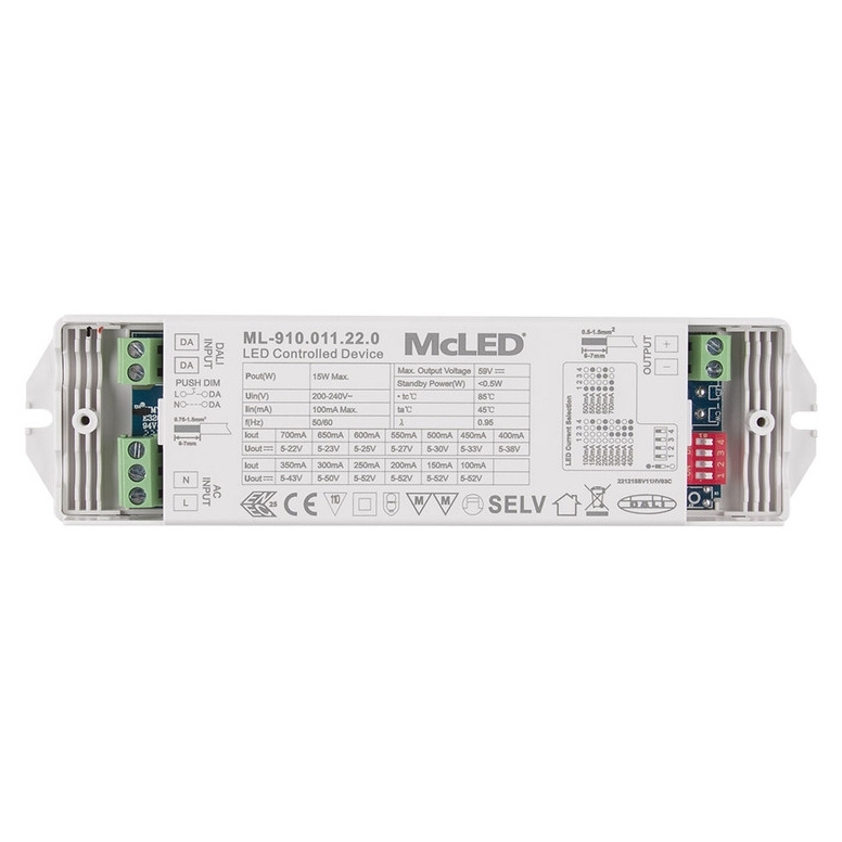 Kompaktní stmívatelný driver s výstupním výkonem 15 W a napětím 5–52 V DC je vhodný pro konstantní napájení LED svítidel, zejména řady McLED Toro 9 W a 15 W. Nabízí řízení jasu pomocí DALI systému nebo funkce Push-DIM (stmívání tlačítkem). Nastavitelný výstupní proud v rozsahu 100–700 mA umožňuje přizpůsobení konkrétní LED aplikaci. Vhodné pouze pro vnitřní použití.