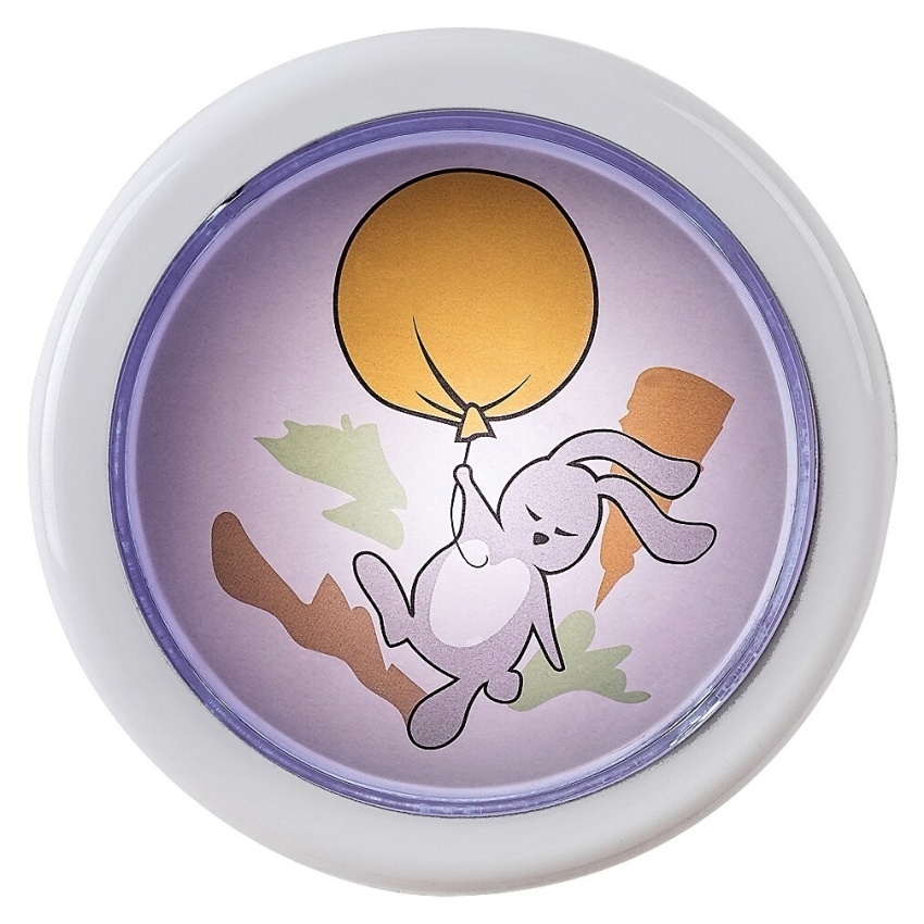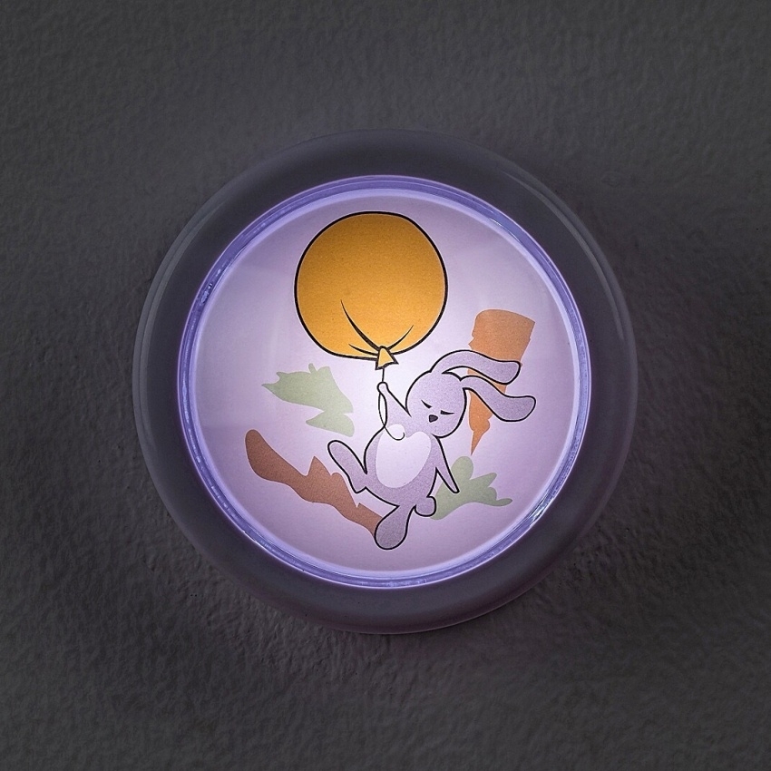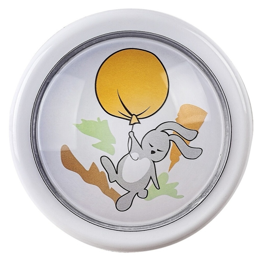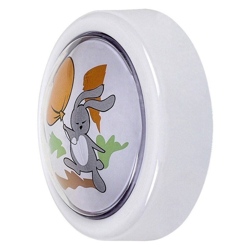 Dětské noční světlo Rabalux Hopply 76073 představuje ideální volbu pro klidné usínání i noční orientaci v dětském pokoji. Lampička má kulatý tvar a je vyrobena z lehkého a odolného plastu, díky čemuž je bezpečná pro děti. Zdobí ji veselý motiv zajíčka s balónkem na bílém pozadí, který vytváří příjemnou a hravou atmosféru. Ovládání je mimořádně jednoduché – světlo se zapíná i vypíná lehkým stisknutím stínítka, takže se obejde bez klasického vypínače. Vestavěný LED zdroj o výkonu 0,3 W vyzařuje studené bílé světlo 6000 K se světelným tokem 5 lm a má životnost až 30 000 hodin. Lampička funguje na dvě baterie typu AA (nejsou součástí balení) a patří do třídy ochrany III s krytím IP20.