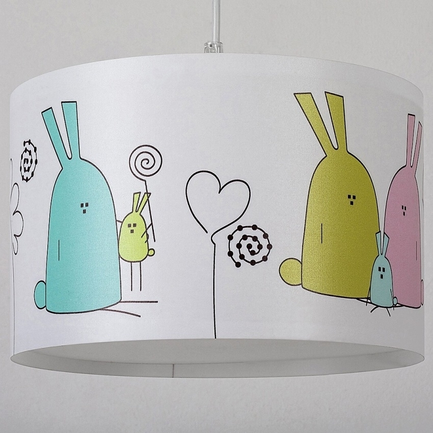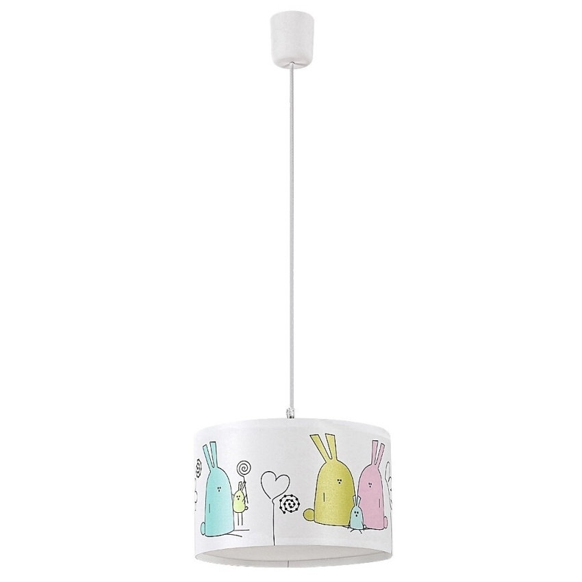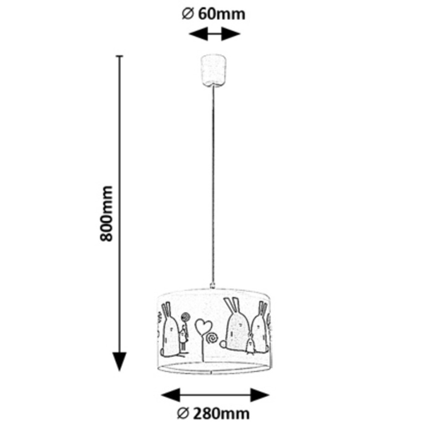 Roztomilé dětské závěsné svítidlo Rabalux Flappy zaujme svým hravým designem s motivem králíčků. Lampa v bílé barvě má plastovou konstrukci a látkové válcovité stínítko, které je otevřené ve spodní části a zdobené barevnými motivy v odstínech modré, růžové a žluté. Působí veselým a přitom jemným dojmem, díky čemuž je ideální volbou pro dětský pokoj. Svítidlo lze připevnit ke stropu pomocí malé válcové základny a je určeno pro jednu žárovku s paticí E27 a maximálním příkonem 40 W (zdroj není součástí balení). Teplé bílé světlo pomůže vytvořit útulnou atmosféru vhodnou pro hraní i odpočinek.