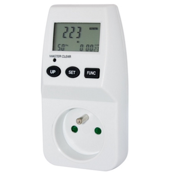 Měřič spotřeby energie - po zadání ceny za kWh Vám přístroj zjistí celkovou spotřebu připojeného zařízení za celou dobu připojení. Vlastnosti: zobrazuje aktuální čas, napětí a frekvenci sítě, proud a příkon spotřebiče, účiník, zaznamenává maximální příkon a spotřebu el. energie za dobu připojení, lze nastavit 2 tarify (dvě různé ceny pro určité hodiny/dny). Další parametry: rozsah měřeného příkonu 0,2 - 4416 W (+/-1%), ukazatel spotřeby 0 - 9999,9 kWh, přesnost hodin +/- 1 min. za měsíc, vlastní spotřeba < 0,5 W, baterie 3x1,5 V (LR44/AG13), životnost baterie 3 měsíce (pokud není v síti).