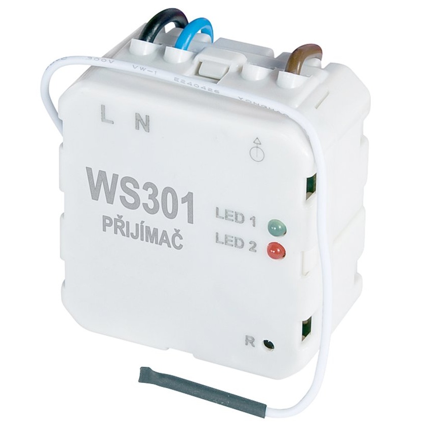 Bezdrátový přijímač pro spínání a časové ovládání elektrických spotřebičů, je možné ovládat až 16-ti různými vysílači s odlišnými funkcemi. Nastavitelná doba funkce časování je 1s až 8 hod. Výhody: k ovládání lze použít vysílače řady WS3xx, malé rozměry, umožňují jednoduchou montáž přímo do instalační krabice, vhodné pro topná tělesa, oběhová čerpadla, osvětlení, klimatizace a další zařízení do 16 A. Funkce dálkově ovládané zásuvky WS301: monostabilní OBVOD (zapnutí a vypnutí jedním tlačítkem), bistabilní OBVOD (zapnutí jedním tlačítkem. a vypnutí druhým tlačítkem.), ČASOVAČ (zapnutí jedním tlačítkem. následné časování a automatické vypnutí). Další parametry: citlivost <-102 dBm, výstup - relé, max. 16A/250VAC.