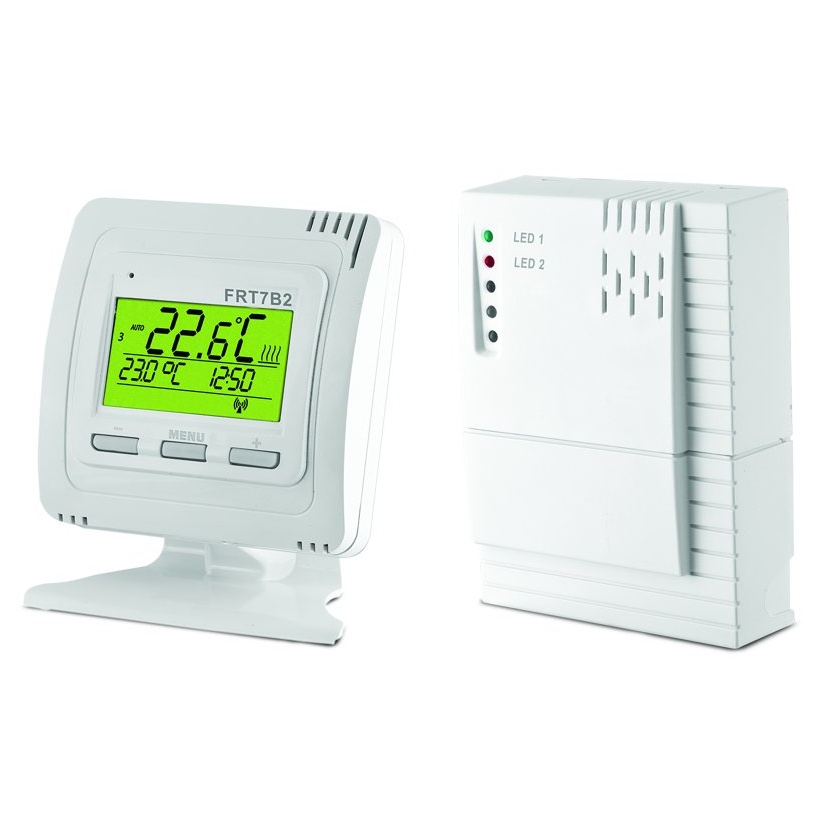 FRT7B2 je set bezdrátového termostatu - vysílače (monitoruje teplotu v konkrétní místnosti) a spínacího prvku - příjimače (obsluhuje připojený tepelný zdroj podle požadavků na teplotu).