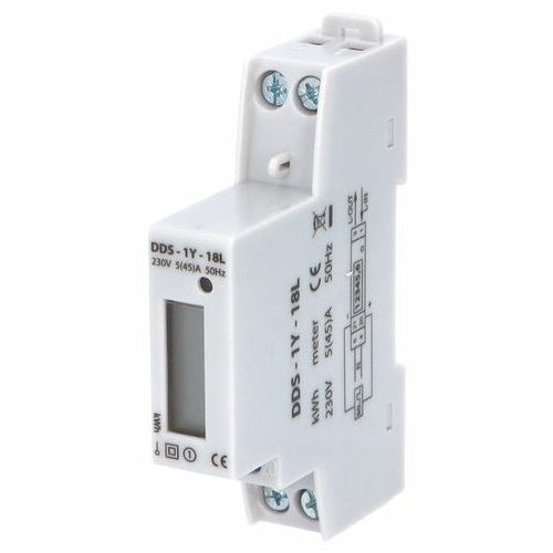 Elektroměr DDS-1Y-18L 45A je jednofázový podružný elektroměr určený pro měření činné elektrické energie ve střídavých sítích 1 × 230 V / 50 Hz v přímém zapojení. Přístroj je osazen LCD displejem s rozsahem zobrazení 00000,01 až 99999,99 kWh a umožňuje měření proudu od minimální hodnoty 0,25 A až do maximální hodnoty 45 A. Elektroměr je konstruován pro montáž na nosnou lištu DIN 35 mm a jeho vestavná šířka je 18 mm, tedy 1 modul.