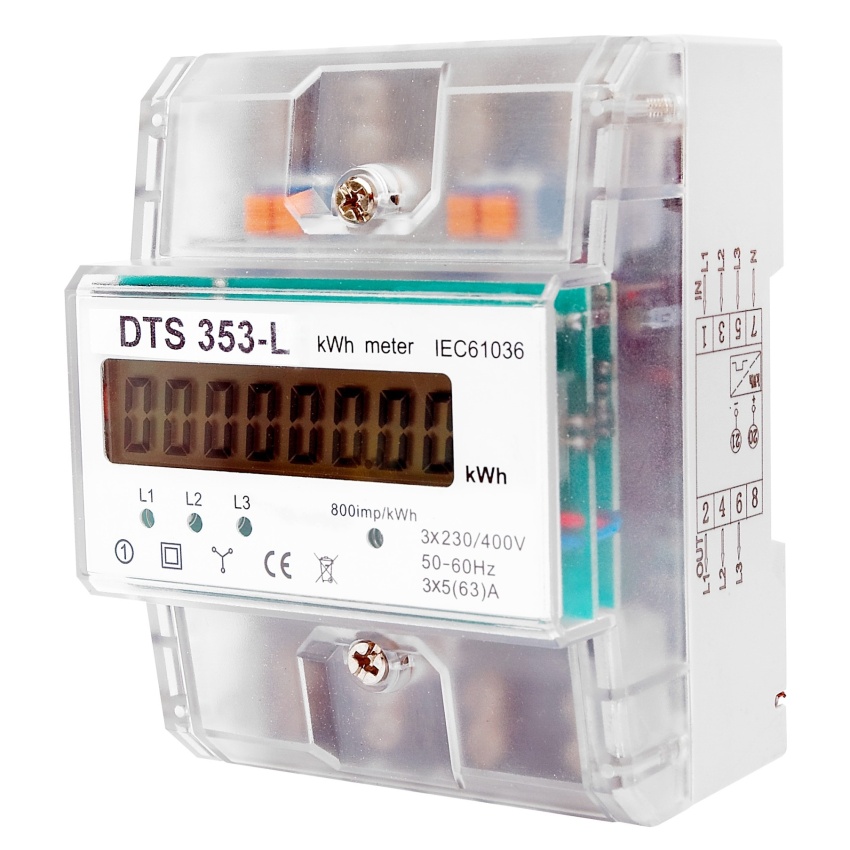Elektroměr 3-fázový, 4 mod., digitální, vlastní spotřeba: <10VA; <2W, impulzní výstup: S0 otevřený konektor ( s optickým oddělovačem), napětí/proud impulzu: <30V DC/<27mA, signalizace impulzu: červená LED.