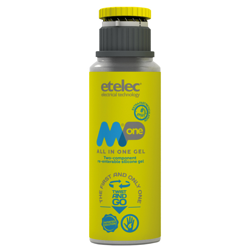 Dvousložkový zalévací gel - ETELEC MPone. Pro výplň a izolaci elektrických spojů. Rychle a jednoduše chrání spoj před nepříznivými přírodními vlivy jako je vlhkost, prach a další nečistoty. Složky gelu "A" i složka gelu "B" jsou obsaženy v jedné láhvy. Po smíchání obou složek gelu je výsledná hmota průhledná s nízkou viskozitou a po vytuhnutí zůstává po celou dobu životnosti spoje rosolovitá. Při samotném vylévání krabičky nebo jiného média krásně zatéká do všech zákoutí. Spoj lze po vytuhnutí jednoduše rozebrat. Gel je šetrný k životnímu prostředí. Navíc nemá žadnou expiraci - můžete jej uchovávat/skladovat mít jej k použití kdykoliv bude potřeba. Dielektrická pevnost 25,5 kV/mm.