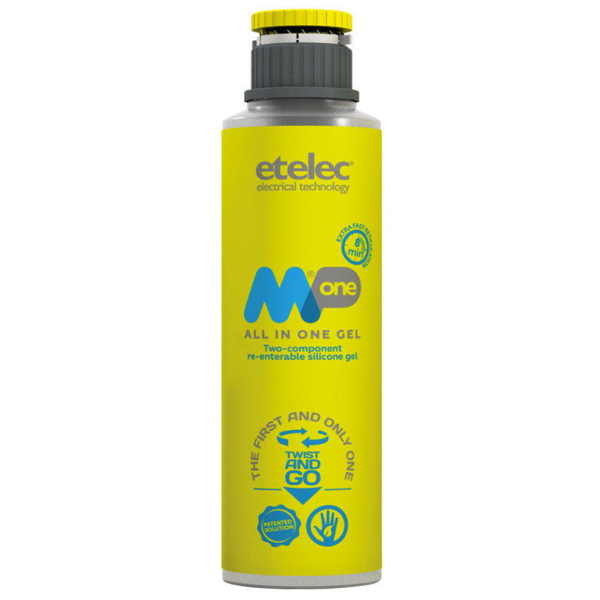 Dvousložkový zalévací gel - ETELEC MPone. Pro výplň a izolaci elektrických spojů. Rychle a jednoduše chrání spoj před nepříznivými přírodními vlivy jako je vlhkost, prach a další nečistoty. Složky gelu "A" i složka gelu "B" jsou obsaženy v jedné láhvy. Po smíchání obou složek gelu je výsledná hmota průhledná s nízkou viskozitou a po vytuhnutí zůstává po celou dobu životnosti spoje rosolovitá. Při samotném vylévání krabičky nebo jiného média krásně zatéká do všech zákoutí. Spoj lze po vytuhnutí jednoduše rozebrat. Gel je šetrný k životnímu prostředí. Navíc nemá žadnou expiraci - můžete jej uchovávat/skladovat mít jej k použití kdykoliv bude potřeba. Dielektrická pevnost 25,5 kV/mm.