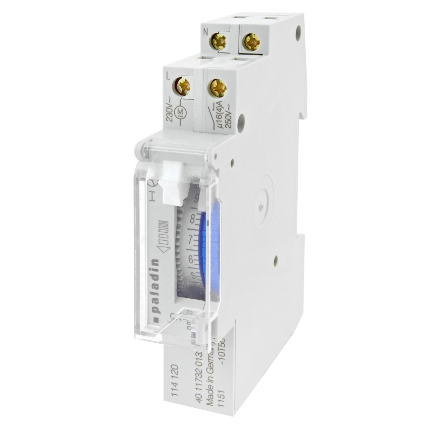 Denní analogové spínací hodiny s rezervou chodu 100 hodin. Spínací hodiny slouží k ovládání libovolného elektrického zařízení podle denního programu nastaveného uživatelem.