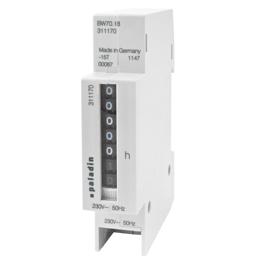 Počítadlo provozních hodin, 230V, 50Hz. Počítadla provozních hodin jsou určeny k měření času po dobu, kterou bylo zařízení připojeno k napájenému obvodu. Bez funkce nulování. Třída ochrany: II.