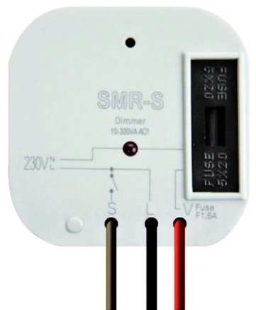 Řízený stmívač pro montáž pod tlačítko. Určený pro montáž do instalační krabice (např. KU-68) do stávající elektroinstalace. Slouží k ovládání jasu žárovek, možnost ovládání z více míst. Ochrana proti překročení teploty uvnitř přístroje - vypne výstup. Pouhou záměnou vypínače za tlačítko, pod kterým je instalováno SMR-U lze dosáhnout efektního řízení úrovně osvětlení. Umožňuje stmívání 12V halogenových svítidel s elektronickým transformátorem (kapacitní zátěž). Nelze použít pro stmívání zářivek či úsporných žárovek. SMR-S - technické specifikace: 3-vodičové připojení, funguje bez připojení “NULY, max. zátěž: 300 VA (žárovky nebo halogenová svítidla s vinutým transformátorem), bezkontaktní výstup: 1x triak, s výměnnou pojistkou.