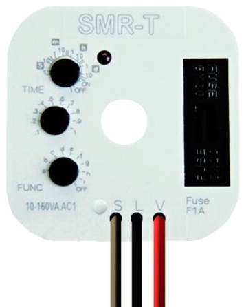 Multifunkční relé určené pro montáž do instalační krabice, pod tlačítko nebo vypínač do stávající elektroinstalace. Výhodné a rychlé řešení standardního vypínače za časově ovládaný a nebo tlačítkově ovládané paměťové relé. 3-vodičové připojení, funguje bez připojení “NULY”. 3-vodičové připojení, funguje bez připojení “NULY”, výstupní výkon: 10 - 160 VA, mezi vstup S a nulovým vodič je možné připojiti jakoukoliv zátěž R, L nebo C ), toto není ale (na rozdíl od SMR-K ) podmínkou.