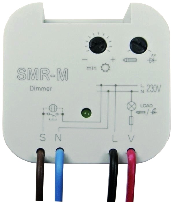 Stmívač pro LED žárovky a stmívatelné úsporné zářivky. Určen pro stmívání a) stmívatelných LED žárovek, b) stmívatelných úsporných žárovek. Umožňuje plynulé nastavení intenzity světla tlačítkem nebo tlačítky paralelně, při vypnutí se nastavená úroveň jasu uloží do paměti apři opětovném zapnutí je jas nastaven již na tuto hodnotu, typ světelného zdroje (LED nebo stmívatelná úsporná zářivka) se nastavuje přepínačem na panelu přístroje, nastavení minimálního jasu potenciometrem na panelu přístroje eliminuje blikání různých typů úsporných zářivek. Tlačítkově ovládaný stmívač určený pro montáž do instalační krabice (např. KU-68) do stávající elektroinstalace, ochrana proti překročení teploty uvnitř přístroje - vypne výstup.