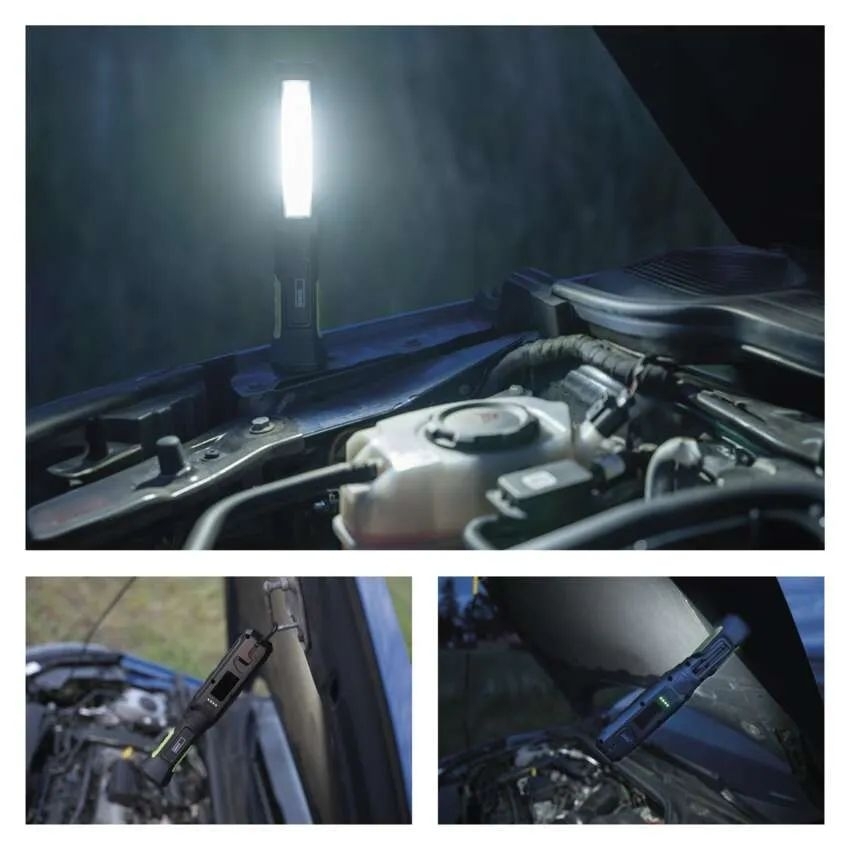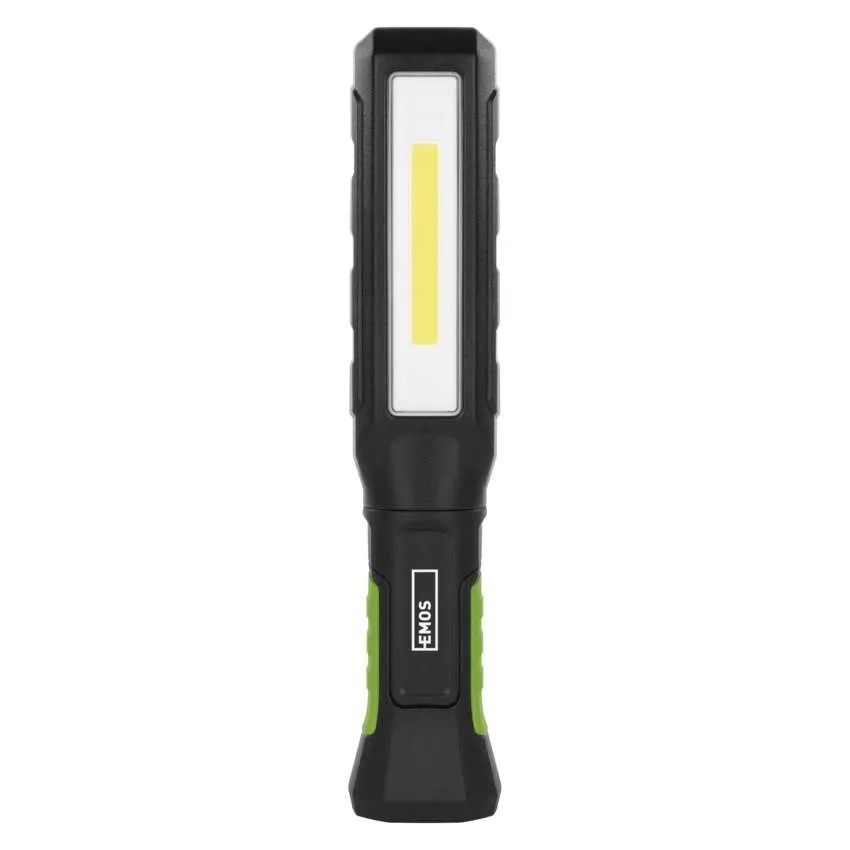 Světelný tok: 800 lm, Akumulátor: ano, Nabíjecí: ano, Technologie: COB LED + SMD LED, Materiál: plast + pogumováno, Barva těla: zeleno-černá, Šířka: 50 mm, Délka: 50 mm, Výška: 255 mm, Napájení: Li-Ion, Dosvit: 110 m, Typ baterie: 2 000 mAh/3,7 V, Baterie součástí balení: ano, Fokus: ne, Maximální dosvit: 110 m, Doba svícení: 2,5–7 h, Režimy svícení: COB LED 100 %, COB LED 50 %, SMD LED 100 %, Vybavení: otočná rukojeť, 2× hák, 2× magnet, Nárazuvzdornost: ano, Příslušenství: USB kabel, Speciální funkce: funkce rychlého vypnutí, funkce ochrany baterie, funkce powerbank, Krytí: ano (IP54), Záruka: 2 roky, Prodejní obal: 1 ks, krabice