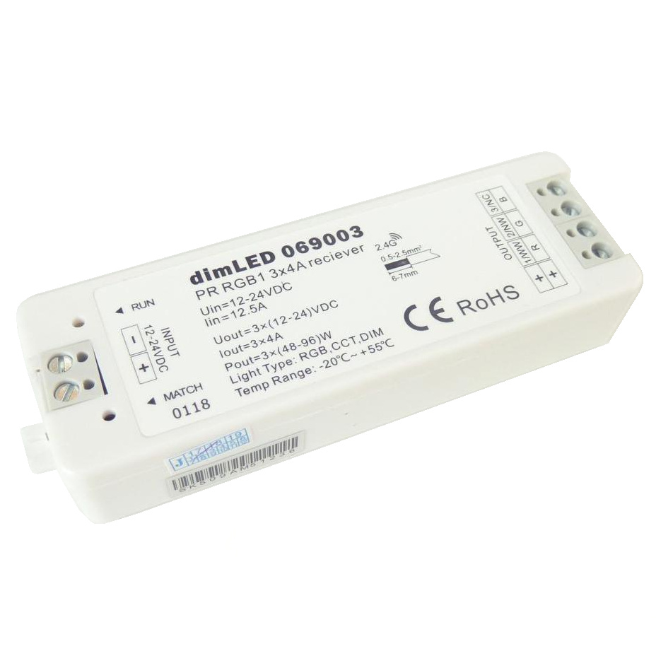 - Radiofrekvenční přijímač stmívač pro RGB LED produkty. Přijímač může být ukrytý (za zdí, sádrokartónem či ve skříni), není nutná přímá viditelnost přijímače pro ovladač.