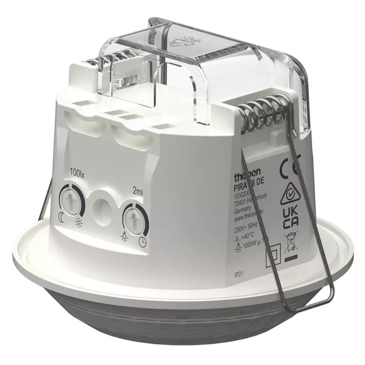THEBEN PIRA T8 DE je kompaktní stropní PIR čidlo vhodné pro interiérové aplikace. Nabízí kruhový detekční rozsah 360° s dosahem o 8 m (50 m2) při optimální výšce montáže 2,5 m. Díky oblasti přítomnosti 3 m je schopno detekovat i minimální pohyb osob v místnosti, což zajišťuje spolehlivou funkci i v klidnějších prostředích, jako jsou kanceláře nebo chodby.
