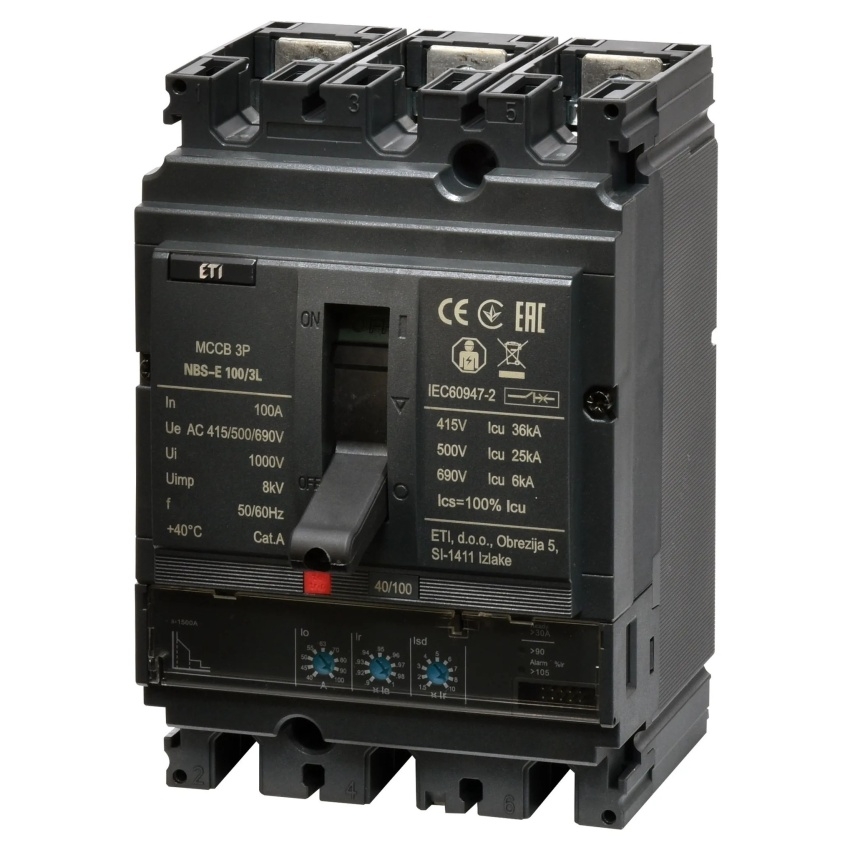 Kompaktní jistič ETI NBS-E 100/3L s jmenovitým proudem 100 A, třípólové provedení, kód 004673041.