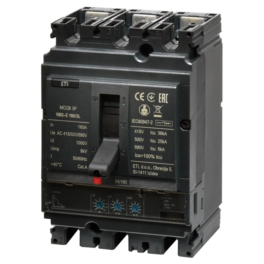 Kompaktní jistič ETI NBS-E 160/3L s jmenovitým proudem 160 A, třípólové provedení, kód 004673055.