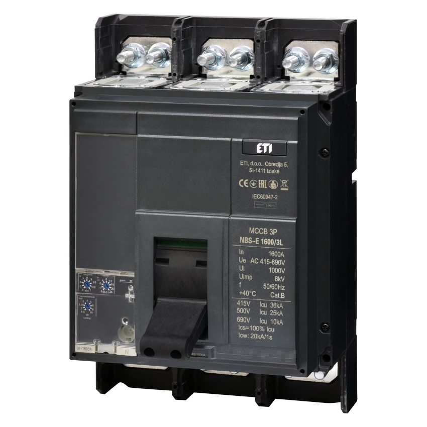 Kompaktní jistič ETI NBS-E 1600/3L s jmenovitým proudem 1600 A, třípólové provedení, kód 004673163.