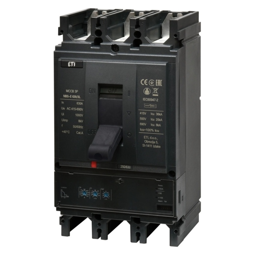 Kompaktní jistič ETI NBS-E 630/3L s jmenovitým proudem 630 A, třípólové provedení, kód 004673139.