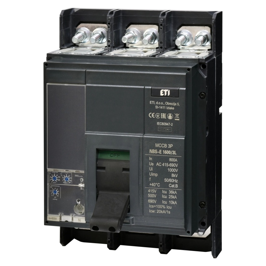 Kompaktní jistič ETI NBS-E 1600/3L s jmenovitým proudem 800 A, třípólové provedení, kód 004673160.