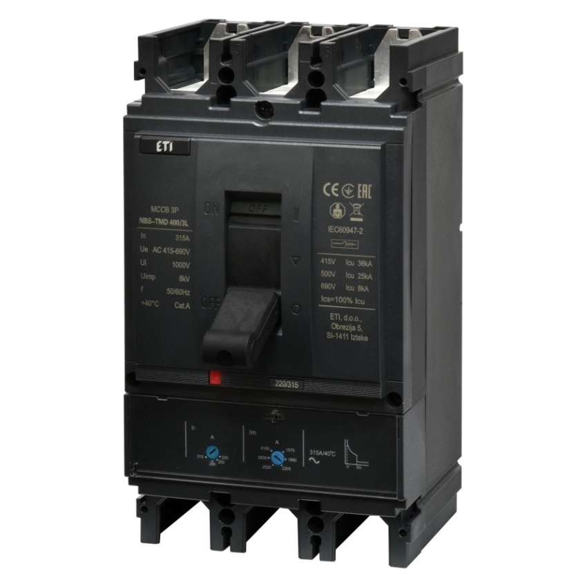 Kompaktní jistič ETI NBS-TMD 400/3L s jmenovitým proudem 315 A, třípólové provedení, kód 004673101.