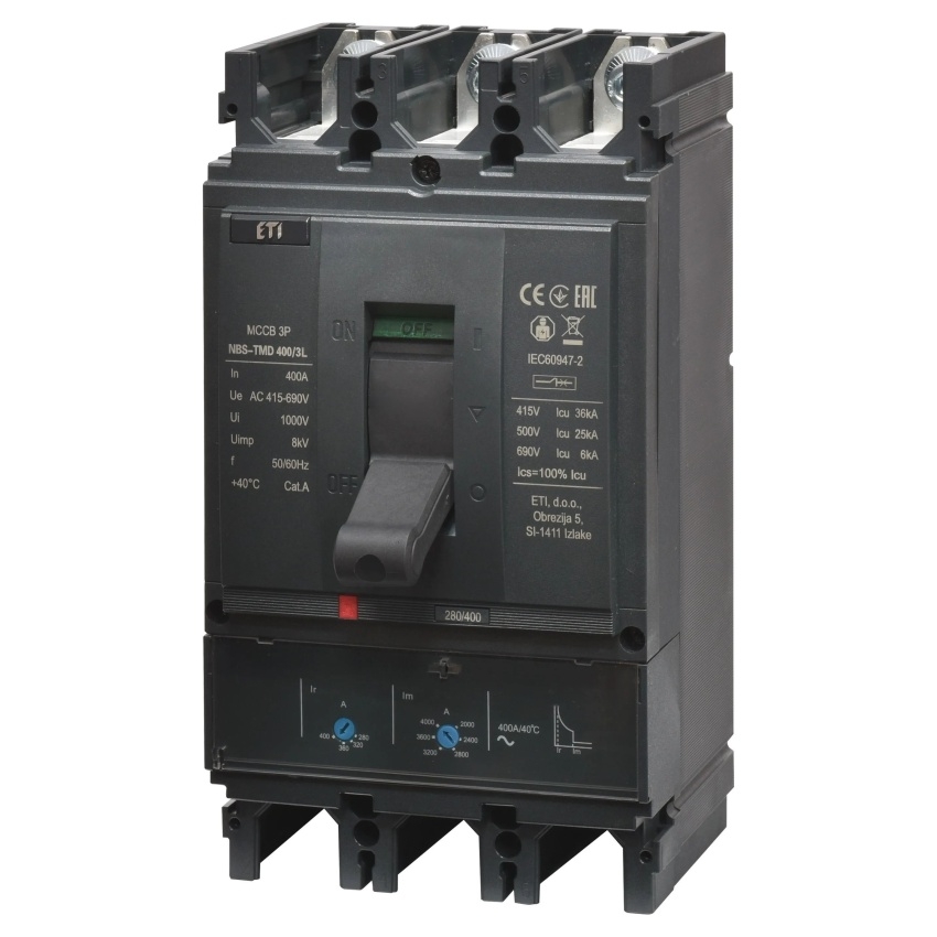 Kompaktní jistič ETI NBS-TMD 400/3L s jmenovitým proudem 400 A, třípólové provedení, kód 004673102.