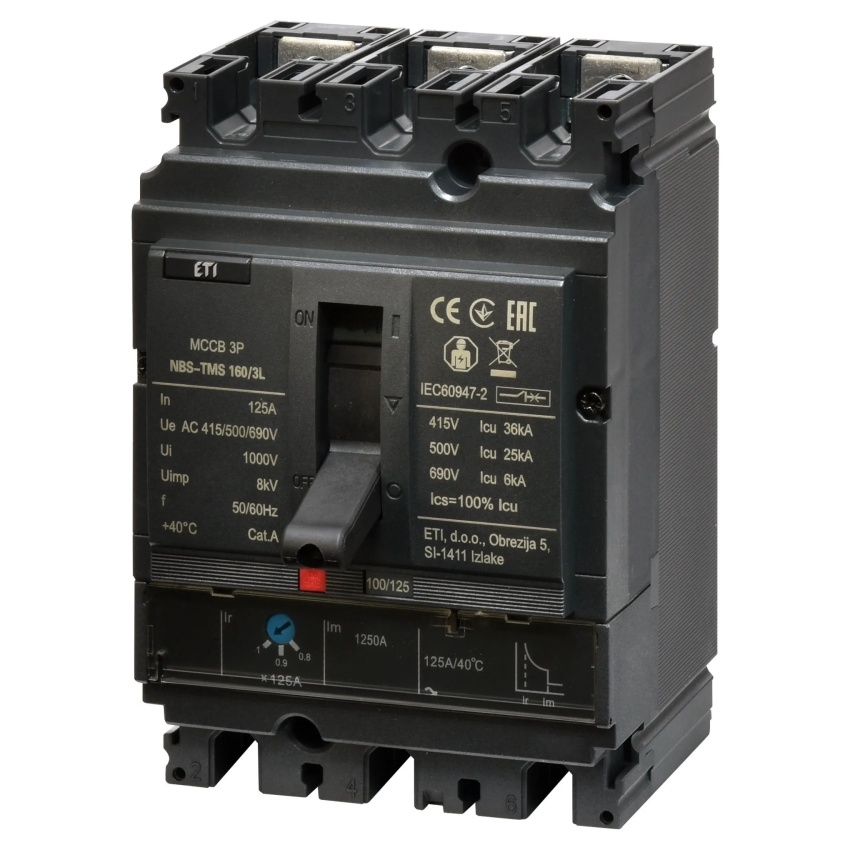 Kompaktní jistič ETI NBS-TMS 160/3L s jmenovitým proudem 125 A, třípólové provedení, kód 004673008.