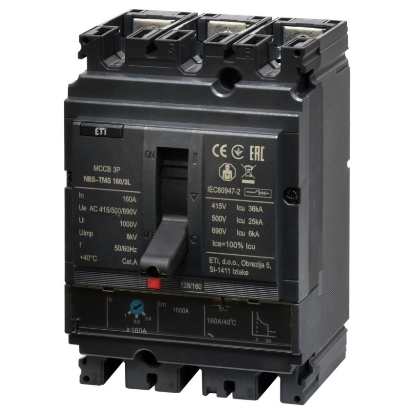 Jistič ETI NBS-TMS 160/3L 160 A je třípólový kompaktní jistič určený pro ochranu elektrických instalací podle normy IEC 60947. Nabízí tepelné nastavení v rozsahu 0,8–1× In a pevné magnetické uvolnění na 10× In. Jmenovité pracovní napětí činí až 690 V AC, izolační napětí 1000 V a zkratová schopnost je 36 kA při 415 V. Přístroj je proveden jako kompletní zařízení v pouzdře s krytím IP20, s předním připojením a volitelnou montáží na DIN lištu. Součástí konstrukce je také indikace vypnutí.