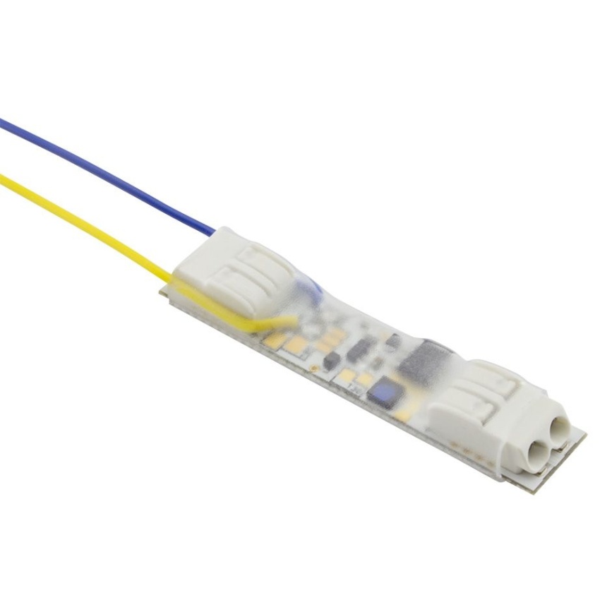 Miniaturní stmívač pro LED pásky ovladatelný libovolným tlačítkem. Modul má svorkovnice pro vstup napájení a výstup pro LED a dva drátové vývody mezi které se připojí libovolné tlačítko.