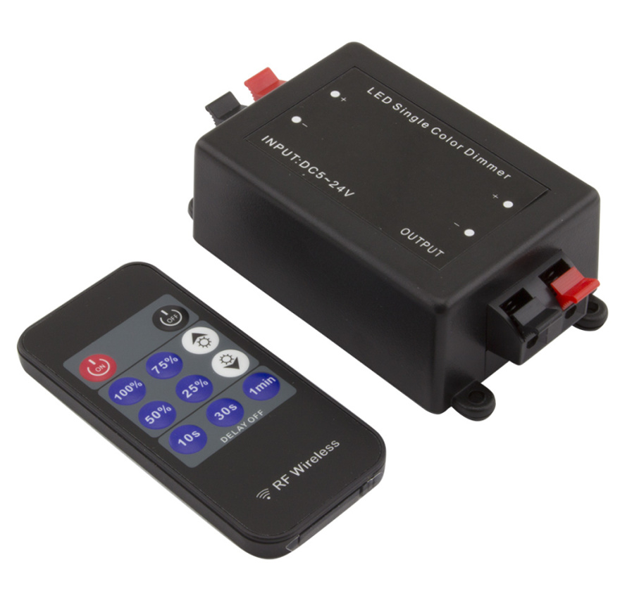Stmívač pro jednobarevné LED pásky s možností stmívání pomocí dálkového ovladače.