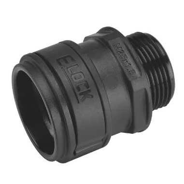 E-Lock je plastový šroubový spoj vyrobený z polyamidu 6, v černé barvě, nehořlavý, bez halogenů a odolný vůči UV záření.
