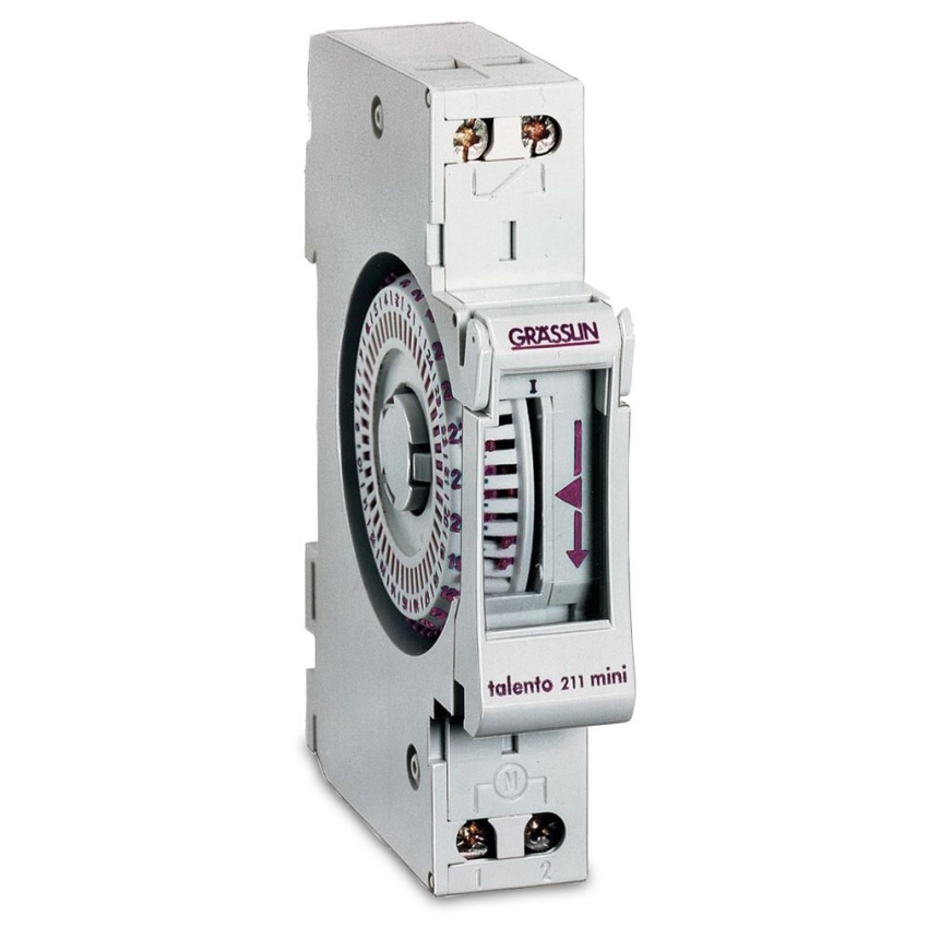 Mechanické spínací hodiny - denní program, se zálohou chodu 50 hodin , ruční přepínač se 3 polohami: FIX ZAP/automatický program/FIX VYP, plombovatelné.