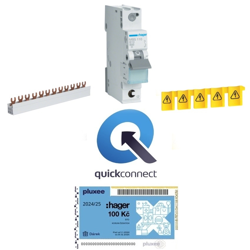 Obsah balíčku 12× jistič MBS110, 1× lišta KDN363F, 1× krytka KZ059 + poukázka pluxee 100 Kč.
