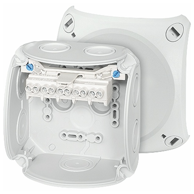 Kabelová krabicová rozvodka z vysoce kvalitního termoplastu. Pro nástěnné aplikace v budovách nebo chráněnou instalaci ve venkovním prostředí. Se stěnovými úchyty a upevněním víka pomocí rychlouzávěrů. S inovativní technologií provedení svorek do 4 mm?, 5pólové. Kabelový vstup přes pružné těsnící membrány ve dně a stěnách skříně. Následné použití kabelových vývodek odstraněním těsnící membrány je možné. S páskem pro uchycení víka.